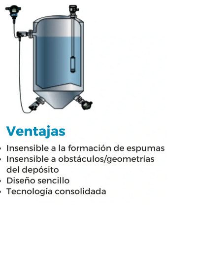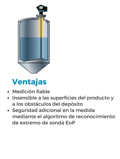 La medición de nivel por radar guiado con instalación de arriba a abajo de un sensor Levelflex ofrece una adaptación perfecta para aplicaciones en todas las industrias. El radar guiado con una puesta en marcha sencilla y una operación sin complicaciones, ahorra tiempo y dinero. Resulta apto para una amplia variedad de aplicaciones; ya sea en simples depósitos de almacenamiento, en productos corrosivos o agresivos o en aplicaciones exigentes.